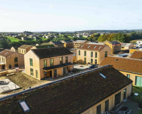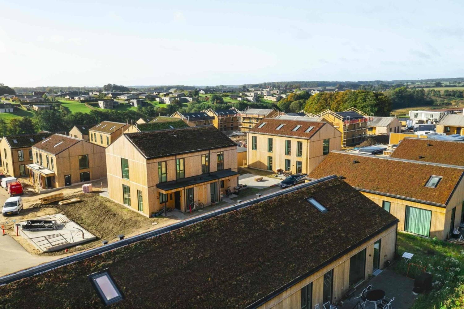 Alle bygninger opføres i varmebehandlet FSC-certificeret træ. Træfacaderne vil blive mere grå med tiden, og komplementere de sorte vinduer på smukkeste vis sammen med det evigt foranderlige og livlige sedumtag.